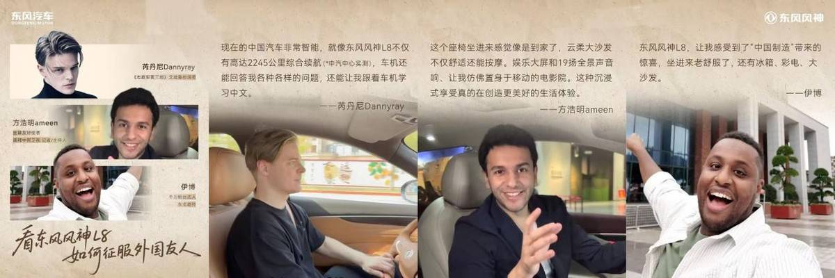 从体育赛场到电竞舞台,东风奕派持续贴近年轻人喜好。在2025英雄联盟全球总决赛期间,东风奕派以赛事bilibili直播合作伙伴的身份直接参与,线上设计多重互动玩法,让用户观赛时能赢取精品好礼;线下打造多场品牌专属观赛活动,汇聚粉丝共同为战队呐喊。用年轻人熟悉的方式,让品牌与“巅峰时刻”深度绑定,进一步拉近与年轻群体的距离。 东风风神方面,结合国庆节期间用户出行场景及家国情怀热点,打造“国际友人走进东风博物馆”的创意社会事件。特邀伊拉克驻新华社记者方浩明、索马里籍抖音达人伊博及《志愿军第三部》艾迪曼扮演者芮丹尼,共访湖北十堰东风博物馆。嘉宾们沉浸式体验东风“芦席棚精神”“干打垒精神”与“马灯精神”,深刻感受到中国汽车工业从艰苦创业到技术创新的非凡跨越。在驾驶东风风神L8后,各位外国友人对其卓越的产品力和出色的驾乘体验给予了高度认可,并表示东风汽车的发展是中国制造业腾飞的生动缩影,中国汽车产业不仅在技术上实现了领先,更以开放包容的姿态向世界传递着创新与品质的力量。