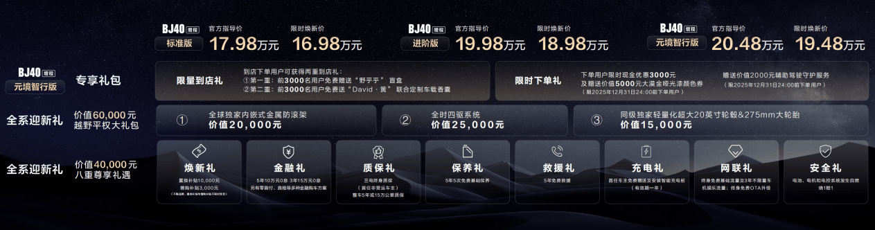 第一大全系迎新礼,价值六万元的越野平权大礼包。包括前面提到的全球独家内嵌式金属防滚架、全时四驱系统和价值1.5万元的同级独家轻量化超大20英寸轮毂和275mm大轮胎,全系三个版型,免费送! 第二大全系迎新礼,价值四万元的八重尊享礼遇,即刻下订可享受: 第一重,焕新礼:置换补贴10000元,增购补贴3000元; 第二重,金融礼:5年10万0息,3年15万0息,另有0首付、直租等多种金融购车方案; 第三重,质保礼:三电终身质保,整车5年或15万公里质保; 第四重,保养礼:5年5次免费基础保养; 第五重,救援礼:5年免费救援; 第六重,充电礼:首任车主免费赠送及安装智能充电桩; 第七重,网联礼:终身免费基础流量及3年不限量车机娱乐流量,终身免费OTA升级; 第八重,安全礼:电池、电机和电控系统发生自燃,烧1赔1。 北京越野在硬派SUV行业内率先推出“烧一赔一”政策与承诺:BJ40增程如因增程动力系统质量原因导致车辆热失控,北京越野将赔付同等或高于原车配置的全新车辆一台,并支付购置税、车船税、交强险、上牌费,最大程度保障用户权益。 这也是北京越野送给消费者的硬核守护,只有对自身安全充满底气,才敢给出“烧一赔一”的承诺,才能做到对消费者安全负责到底。 北京越野带来了元境智行版专享礼包:限量到店礼和限时下单礼。两项限量到店礼:前3000名用户,免费送“野乎乎”盲盒和北京越野与国际知名调香师David·黄联合定制的车载香囊。两项限时下单礼:第一项:从即刻起到年底下订用户,限时享现金优惠3000元;以及价值5000元的大漠金哑光漆颜色券。第二项:从即刻起到年底下定用户,限时赠送价值2000元的辅助驾驶守护服务。