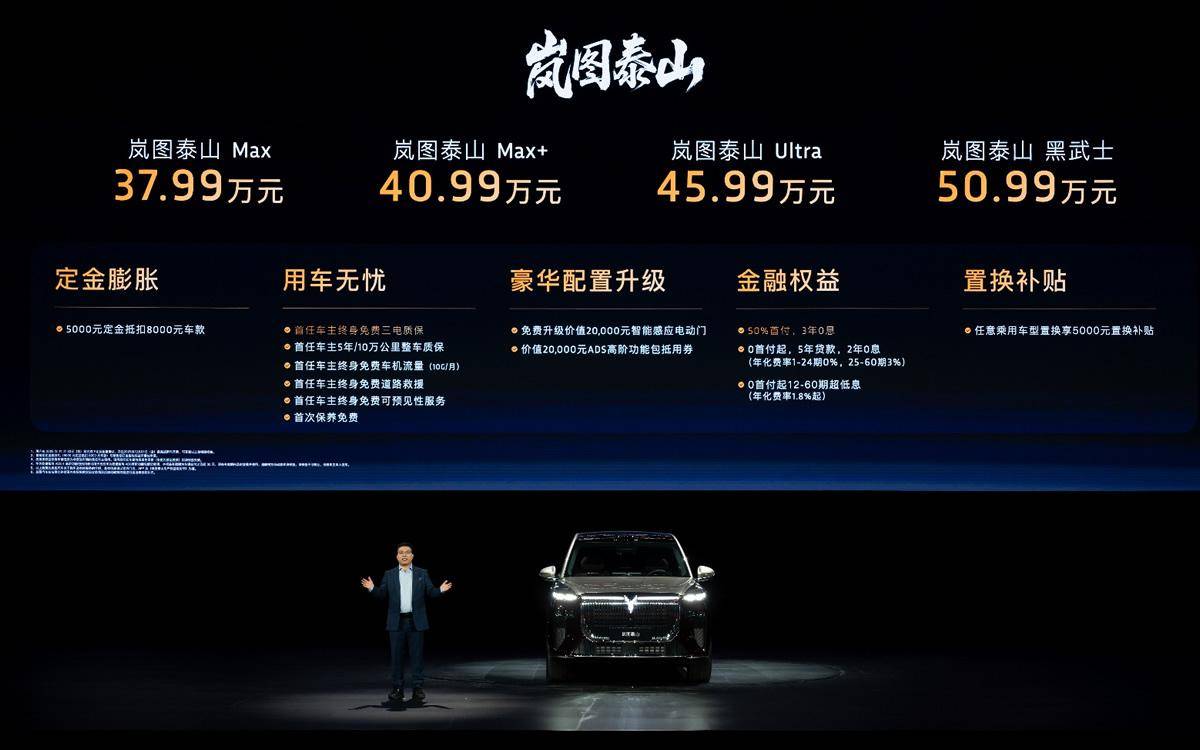 【2025年11月18日,深圳】11月18日,岚图汽车在深圳国际会展中心正式推出旗下全新力作——岚图泰山。共推出Max版、Max+版、Ultra版、黑武士版四大版型,官方指导价为37.99万元-50.99万元。同时,还公布了价值48000元的上市首销期限时权益,以及包括专属交付礼遇、积分增值回馈、购置税无忧保障在内的尊享计划。 岚图泰山背靠东风56年造车底蕴,是岚图顶级整车技术与华为智能科技的集大成者,它将以泰山般的气度,重新定义大六座豪华SUV的设计、驾控与安全标准。