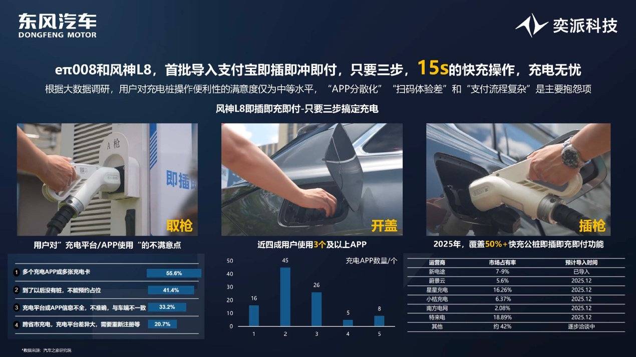 充电体验方面,化繁为简,消除用户痛点。首推支付宝“即插即充即付”功能,“取枪、开盖、插枪”三步15秒即可完成充电。该功能已在东风风神L8上首发,并即将搭载于东风奕派eπ008,今年底覆盖主流充电桩品牌,让“无感充电”成为标配。