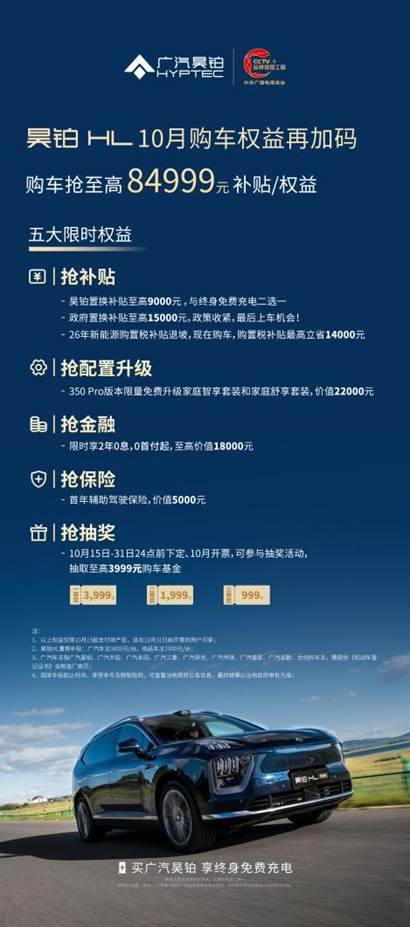10月权益倒计时最后1天,抢至高84999元购车补贴 随着十月进入尾声,昊铂HL增程版的十月购车权益也只剩最后1天。有意向的用户抓紧入手,抢以下五大限时权益: 置换补贴:享受至高9000元昊铂置换补贴或“终身免费充电”权益(二选一);叠加政府置换补贴至高15000元。此外,新能源购置税政策收紧在即,现在购车至高节省14000元。 配置升级:350 Pro版本限量免费升级总价值22000元的“家庭智享套装”和“家庭舒享套装”。 金融方案:全系限时享受2年0息,0首付起,至高价值18000元。 保险护航:首年辅助驾驶保险,价值5000元。 购车补贴:10月31日前下订广汽昊铂任意车型并完成开票,即可参与官方APP抽奖活动,有机会赢取至高3999元购车补贴,100%中奖率!
