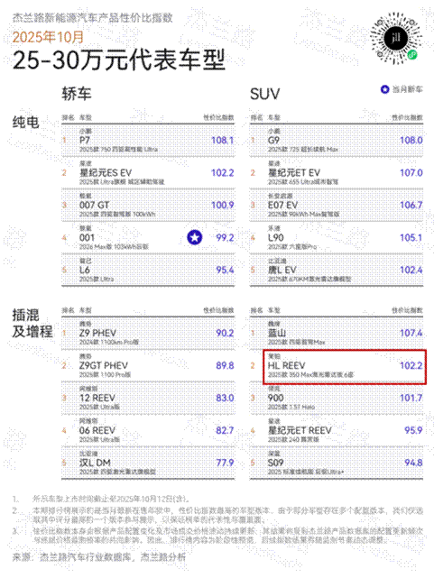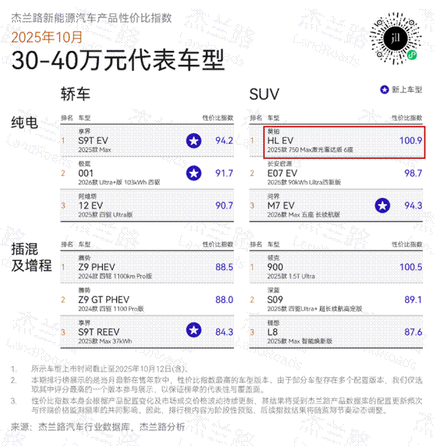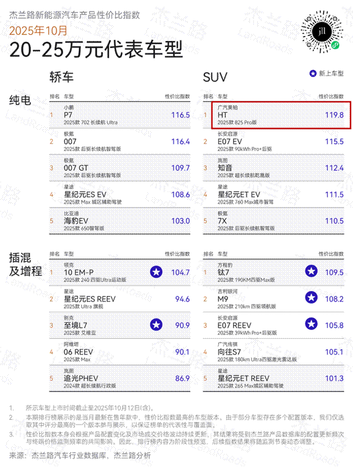 近日,杰兰路正式发布10月新能源汽车产品指数榜单,广汽昊铂旗下车型凭借卓越的产品实力与豪华配置,在多个细分市场榜单中名列前茅:昊铂HT 2025款825 Pro版位列20-25万级纯电SUV第一;昊铂HL EV 750 Max六座激光雷达版位列30-40万级纯电SUV第一;昊铂HL REEV 350 Max六座激光雷达版位列25-30万级插混及增程SUV第二。 这些成绩,印证了广汽昊铂在塑造产品价值与用户体验方面的持续突破。其中,昊铂HL增程版,更以“科技平权”理念与“大满配”的产品哲学,成为市场瞩目的焦点。