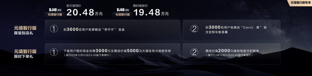 自此,BJ40增程家族一共拥有标准版、进阶版、元境智行版三个版型。北京越野还带来了BJ40增程三个版型均能享受的两大全系迎新礼。 第一大全系迎新礼,就是价值六万元的越野平权大礼包。包括前面提到的全球独家内嵌式金属防滚架、全时四驱系统和价值1.5万元的同级独家轻量化超大20英寸轮毂和275mm大轮胎,全系三个版型,免费送! 第二大全系迎新礼,是价值四万元的八重尊享礼遇,即刻下订可享受: 第一重,焕新礼:置换补贴10000元,增购补贴3000元; 第二重,金融礼:5年10万0息,3年15万0息,另有0首付、直租等多种金融购车方案; 第三重,质保礼:三电终身质保,整车5年或15万公里质保; 第四重,保养礼:5年5次免费基础保养; 第五重,救援礼:5年免费救援; 第六重,充电礼:首任车主免费赠送及安装智能充电桩; 第七重,网联礼:终身免费基础流量及3年不限量车机娱乐流量,终身免费OTA升级; 第八重,安全礼:电池、电机和电控系统发生自燃,烧1赔1。 北京越野在硬派SUV行业内率先推出“烧一赔一”政策与承诺:BJ40增程如因增程动力系统质量原因导致车辆热失控,北京越野将赔付同等或高于原车配置的全新车辆一台,并支付购置税、车船税、交强险、上牌费,最大程度保障用户权益!