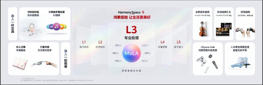 鸿蒙座舱率先进入“智能座舱L3” 时代 智能交互更类人 目前,鸿蒙座舱总用户数已超130万。随着混合大模型MoLA架构持续升级,它将为用户带来更好的座舱体验。本次发布会,鸿蒙座舱功能再次迎来智能体验新升级:智慧语音不仅从被动响应进阶到了主动建议,而且还具备了调用工具的功能,可实现点外卖、支付等功能。这也标志着鸿蒙座舱已率先进入“智能座舱L3”时代。 在生态层面,鸿蒙座舱整合了南北向的硬件与应用全链路能力,融合了影音、娱乐、办公等全场景服务,把座舱打造成一个无限延伸的智能生活空间。基于HUAWEI SOUND与生态伙伴联合打造的空间音专区全新上线,可以为消费者带来“声”临其境般的影音体验。 华为乾崑APP正式发布 打造用户社区生态 华为乾崑APP正式公开发布。这是为华为乾崑智驾、鸿蒙座舱等乾崑解决方案打造的官方应用,集成了社区、探索、ADS、展厅、爱车、商城等功能。用户可以在APP上反馈用车体验,并将得到专业答复;用户也可发起华为乾崑心愿单,有机会让具有创意的需求变为真实的出行体验;此外,停车、充电、洗车等生态应用功能也将陆续上线华为乾崑APP。
