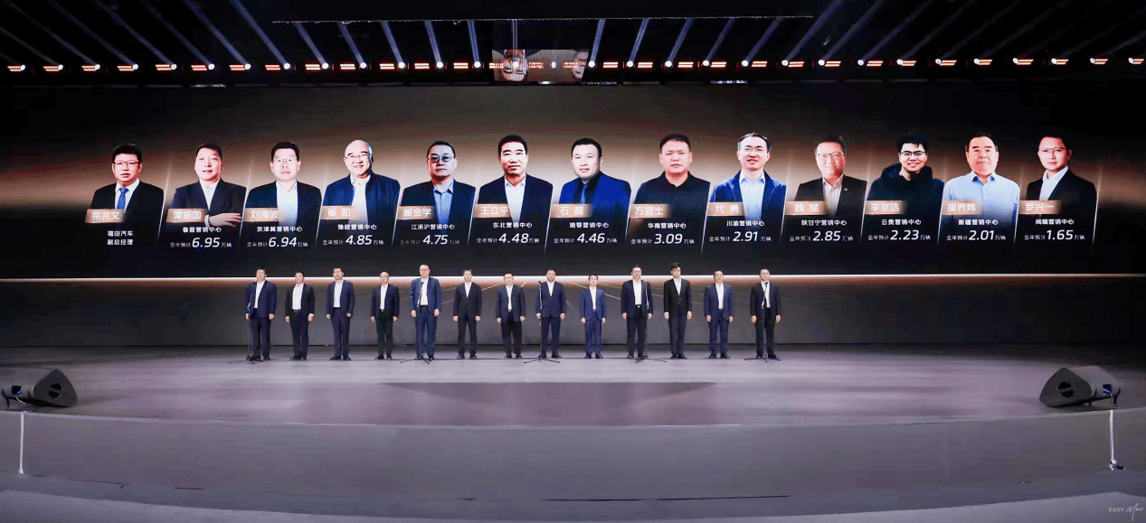 为实现目标,刘旭光提出六大核心变革举措:一是坚定渠道战略调整,加大新能源专网开发力度,优化分销与直销融合模式,构建“规模+质量”并重的渠道体系;二是商务政策精益化,构建“按劳取酬、多劳多得”架构体系,推进政策管理线上化;三是强化渠道赋能培育,分层开展销售技巧、生态业务等培训,全年培育预算超3700万元;四是深化新媒体与互联网营销,打造“线上锁单+线下交付”新模式,依托核心流量平台实现品牌全域曝光,配套阶梯激励、流量扶持等政策激活终端势能;五是生态业务深度运营,扩大经租、二手车、补能等业务规模,创新车电分离与电池银行模式,培育经销商多元盈利点;六是强化金融与保险支持,深化与核心保司合作,构建价格低、多元化、差异化的金融产品体系。 2026年目标的达成,离不开业务端与区域端的协同攻坚。大会伊始,13位事业部总裁与13位区域营销中心负责人(含12位中心总经理及分管领导)集体亮相,展现了福田“主力作战部队+战区支援中心”的矩阵式作战体系。作为福田与合作伙伴结成的“发展与利益共同体”,这支核心团队既是战略落地的关键抓手,也是赋能渠道、联接伙伴的坚实桥梁,他们将带领团队践行 “敢于竞争、敢于胜利” 的宣言,推动营销变革、渠道优化、政策落地等举措直达终端,为全年销量增长与高质量发展提供坚实保障。