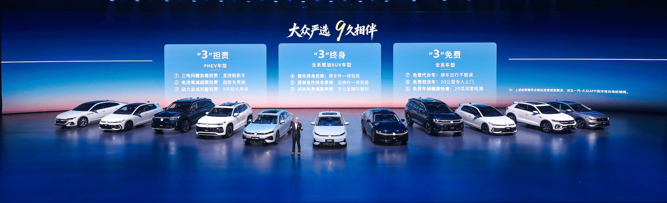 九大承诺彰显担当 满油礼遇共赴美好 作为拥有35年积淀、超3000万客户基盘的合资标杆企业,一汽-大众依托雄厚实力与完善的服务体系,将严选品质化作长久陪伴,为客户带来大厂独有的确定感。在本次发布会上,一汽-大众还重磅推出“大众严选 9久相伴”专属承诺,依托“三担责、三终身、三免费”9项承诺,为客户提供全生命周期可靠保障,以十足诚意彰显领军品牌的责任与担当。