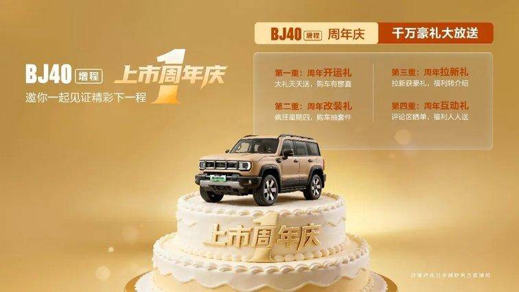 4月7日,“BJ40增程上市周年庆”主题直播活动在专业越野网红胜地北京越涯庄成功举办。在这场持续6小时的超长直播中,北京越野与全网用户共同见证BJ40增程的成长与成绩。 “BJ40增程周年庆”活动期间可享四重豪礼: 第一重:周年开运礼——大礼天天送,购车有惊喜。4月7日起至4月23日,于北京越野直播间,每日抽取5套价值4280元的征途尊享哑光漆面膜; 第二重:周年改装礼——疯狂星期四,购车抽套件。4月7日起至4月20日,凡活动期间购买BJ40增程车型的用户,自动获取参与抽奖资格,北京越野将在4月16日、23日的两个“疯狂星期四”,于直播间现场抽取5位用户免费获取 BJ40增程官改套件一套; 第三重:周年拉新礼——拉新获豪礼,福利转介绍。4月7日起至4月23日。北京越野诚邀官方合伙人,凡拉新转介绍BJ40增程车辆达10台者,可获得官改套件2套或APP等值积分; 第四重:周年互动礼——评论区晒单,福利人人送。4月7日起至4月23日,每日北京越野抖音官方账号评论区,凡晒订单(4.7及之后下定)评论者,和第40层/80层/120层(依此类推)评论者,可凭借评论截图私信后台获取野乎乎公仔1个。 以上4重大礼可叠加超级置换季活动:4月30日前,购买BJ40增程元境智行的用户,可享超级置换20000元;BJ40 增程赤兔版老客户转介绍可获得6000元奖励。以上两款车型均可享受7年超低息的金融政策,首付10%起,即可将爱车开回家。