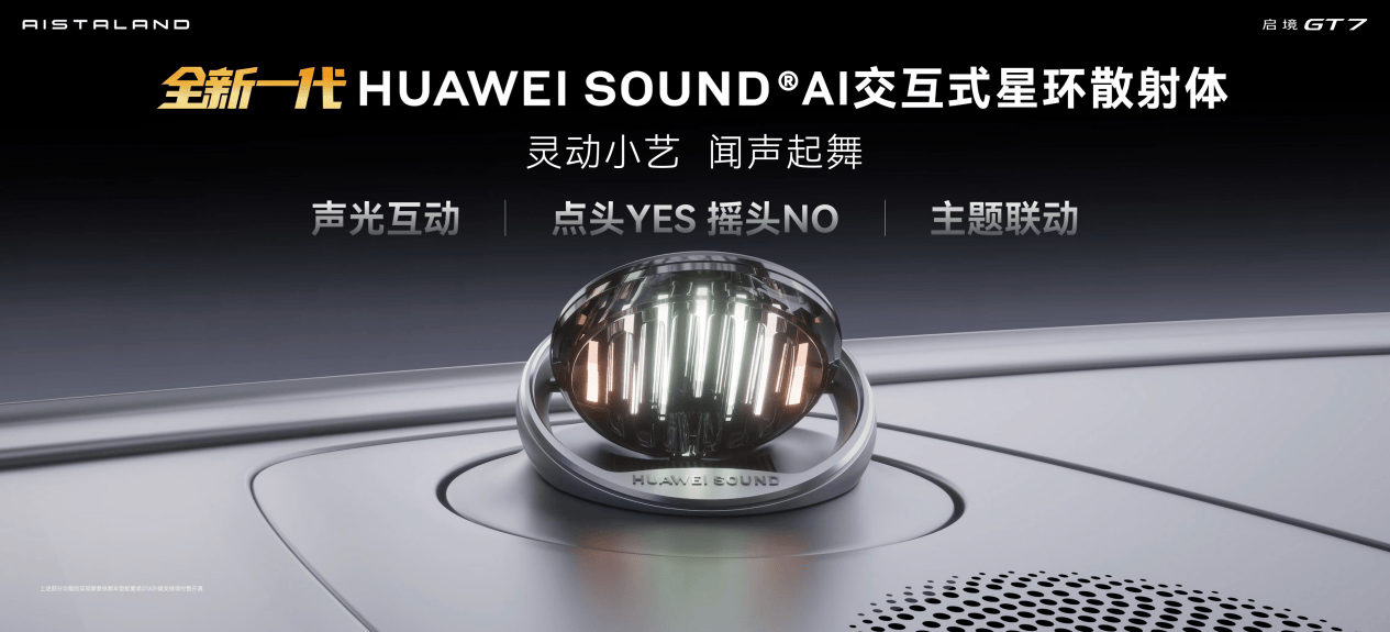 同时,启境GT7首创全新一代HUAWEI SOUND AI交互式星环散射体。位于中控台顶部中央的灵动智慧伙伴,接到指令会主动转向你、认真聆听,还会点头、摇头,灵动可爱。跑山、智驾等模式还有专属声光联动,让人车交互更具温度与仪式感。 此外,启境GT7同级首发的全新一代HUAWEI XPIXEL双百万像素彩色智慧投影大灯,支持互动迎宾、随心画、巨幕观影等多样场景,配合星闪技术和ADS全域融合架构,实现安全照明,智驾交互,情绪表达,游戏互动的全场景体验,让灯光成为你与外界交流的新方式。